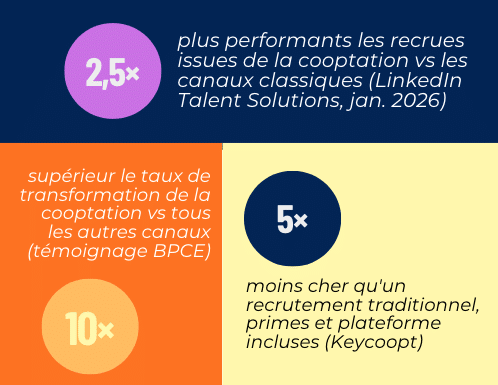 Taux de conversion des cooptations vs autres canaux, coût par embauche, rétention à 6 mois, satisfaction du coopteur mesurez tout. Les données vous diront si le programme fonctionne et où l'améliorer. La cooptation sans données, ça reste du bouche-à-oreille.